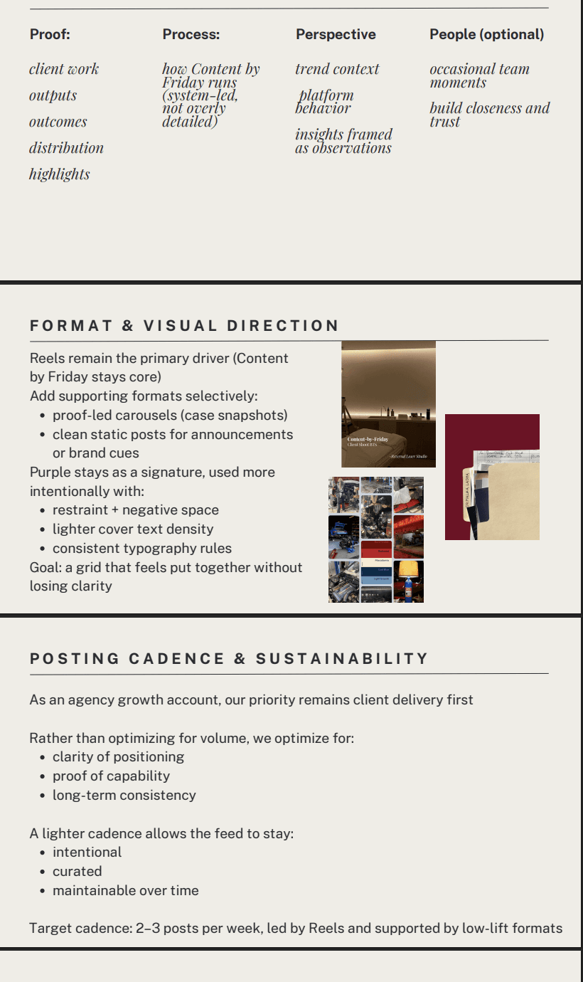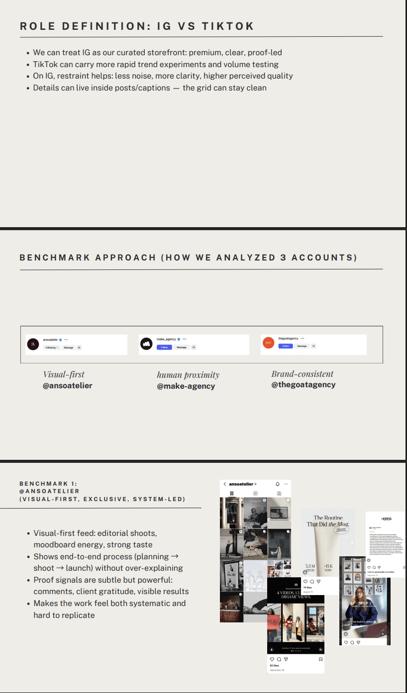 Designed a lean, research-led Instagram content system for a marketing agency to strengthen positioning, client visibility, and inbound trust — without increasing production load. The project focused on translating visual benchmarks and platform behavior into a sustainable posting structure. Rather than chasing trends or opinion-led content, the strategy prioritizes proof, process, and clarity, positioning Instagram as a curated storefront rather than a high-volume channel. The outcome is a scalable system that balances aesthetics, strategy, and operational reality, allowing the agency to stay consistent while remaining client-first.